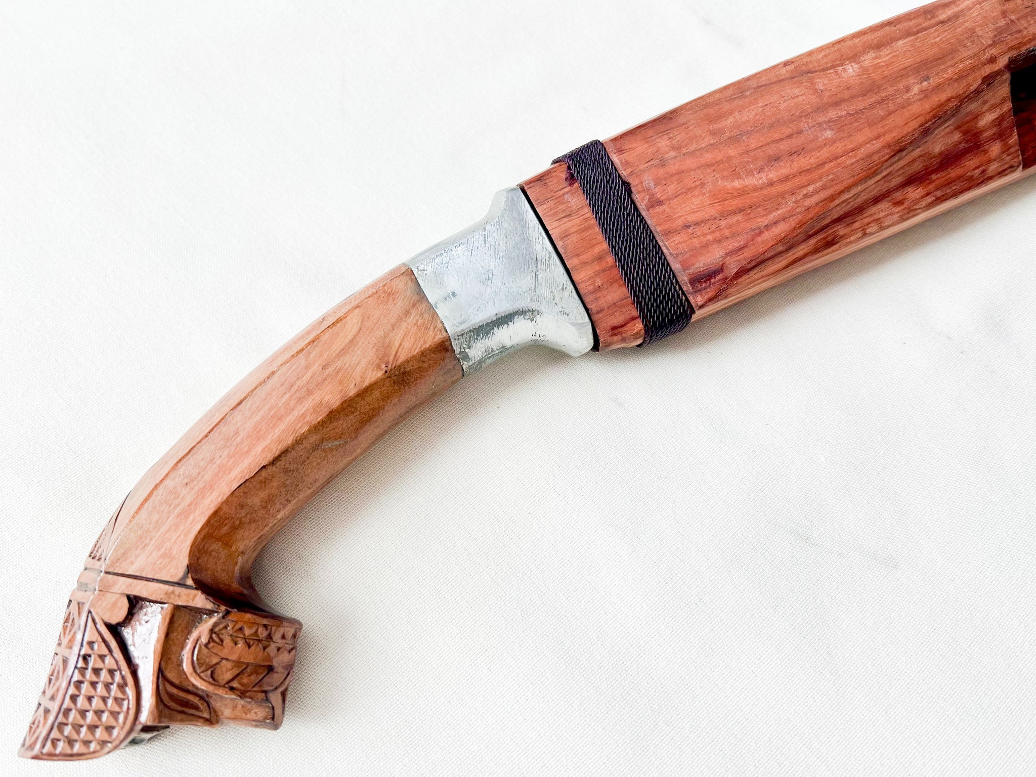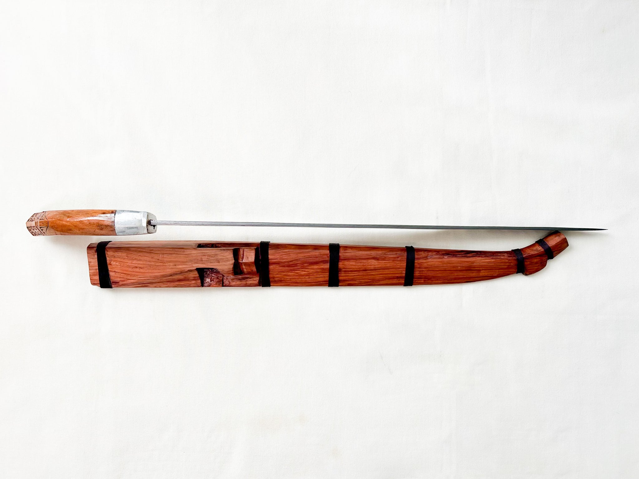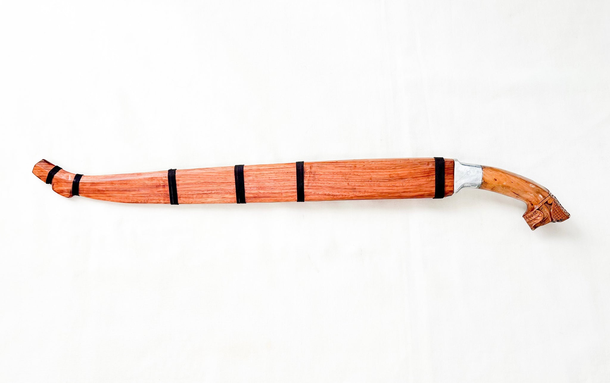 The scabbard is made from solid narra wood, fitted precisely to the blade and reinforced with traditional cord bindings. Its natural grain and warm finish complement the tribal craftsmanship of the handle.