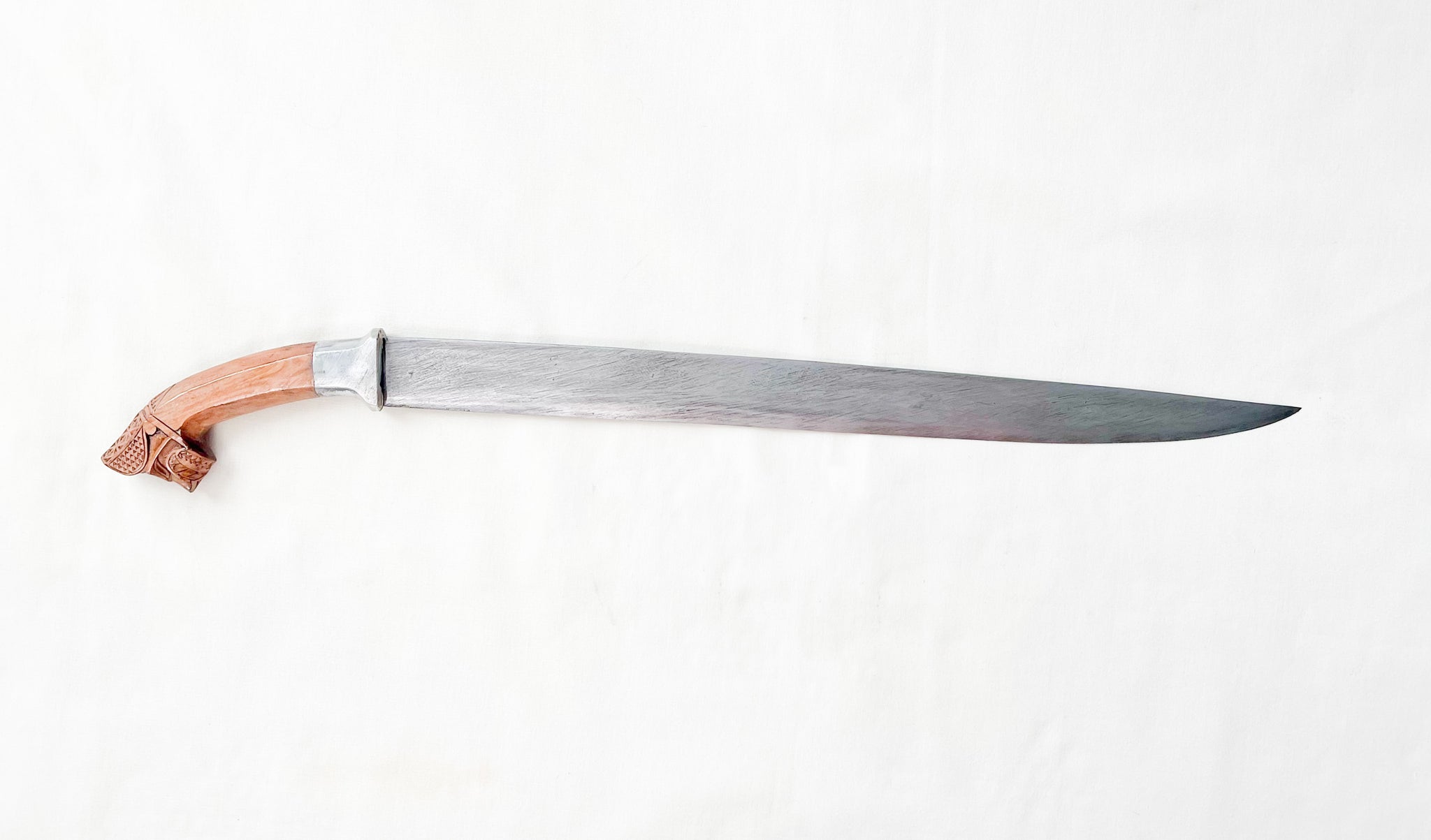 The handle is carved from Filipino hardwood and shaped into an ergonomic pistol grip. Its pommel showcases tribal animal-inspired carving, giving the piece bold character and an authentic cultural aesthetic. Each carving is done entirely by hand, making every handle unique.