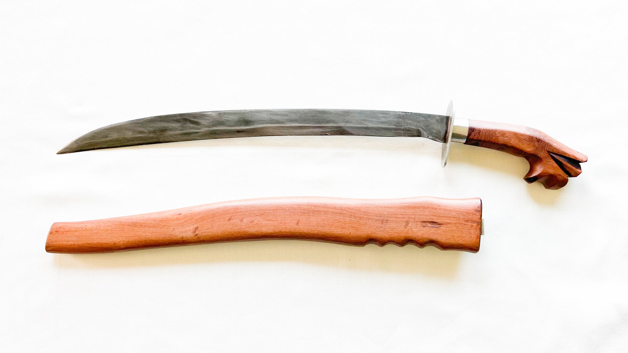 The handle and scabbard are carved from indigenous hardwood sourced from the Southern Philippines, prized for its rich brown color, smooth grain, and durability. The handle incorporates a traditional Visayan sculpted pommel and an ergonomic contour that settles naturally into the hand, offering a secure and confident grip.